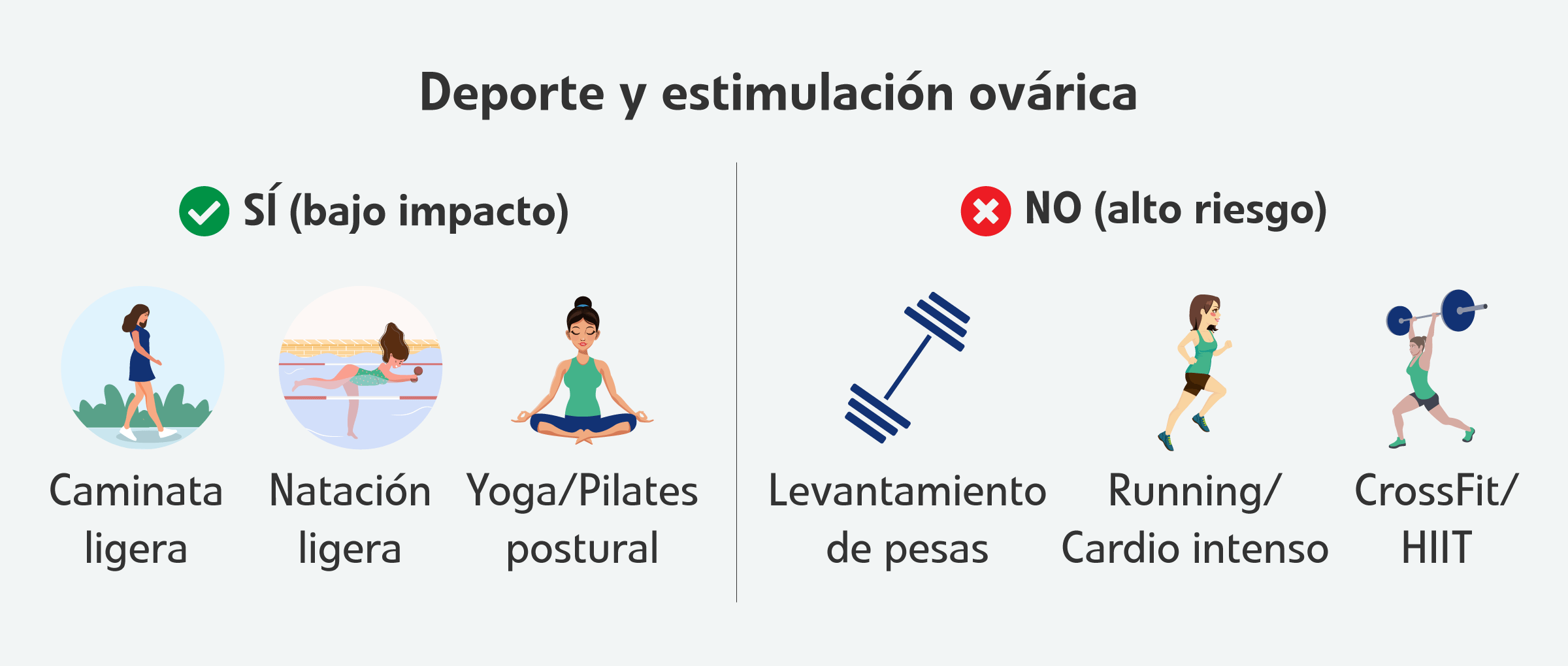 Mantener un estilo de vida activo favorece el flujo sanguíneo hacia todos los órganos y su oxigenación celular, incluyendo al sistema reproductor, lo que ayuda a mejorar su funcionamiento, así como a reducir la ansiedad, pero los fármacos hormonales administrados para promover el desarrollo folicular múltiple provocan un aumento considerable en el volumen de los ovarios, por lo que resulta vital priorizar disciplinas deportivas de bajo impacto y descartar movimientos bruscos para proteger la zona pélvica de cualquier posible complicación.